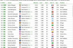 CIES球员应得最高年薪排行:姆巴佩2280万欧居首,萨拉赫位居次席
